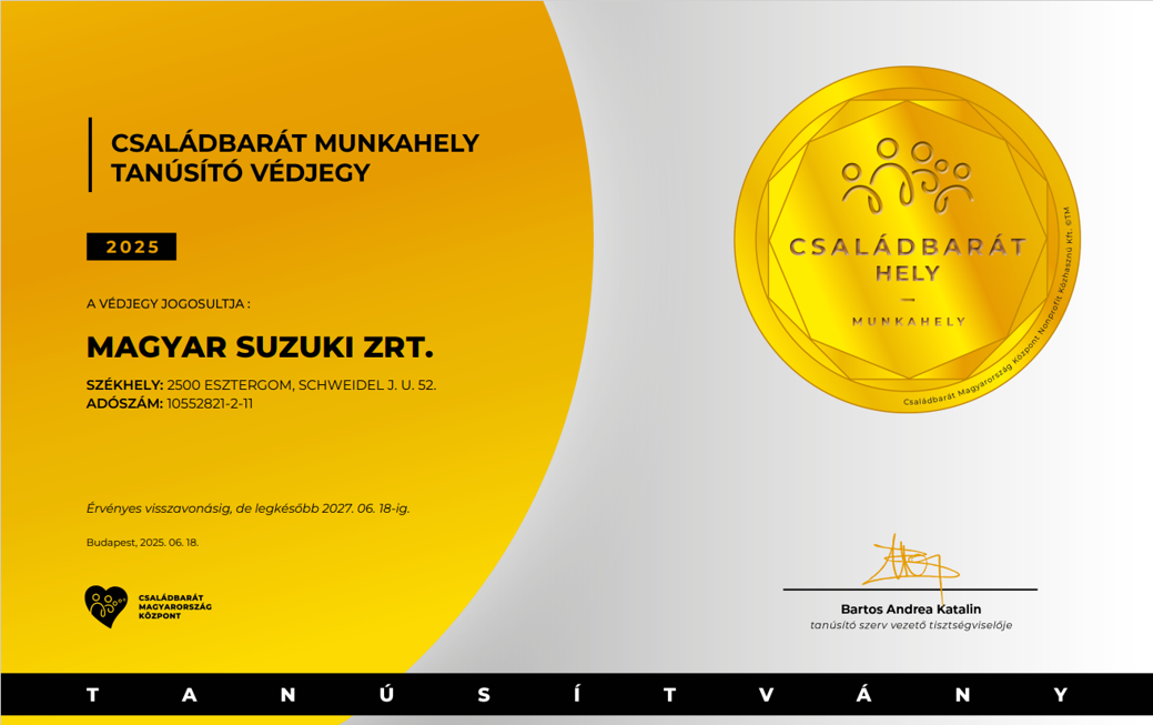 Vállalatunk elnyerte a Családbarát Hely védjegyet. A Családbarát Magyarország Központ által nekünk ítélt minősítést olyan munkahelyek viselhetik, amelyek segítik és támogatják munkavállalóik családon belüli szerepeinek betöltését.