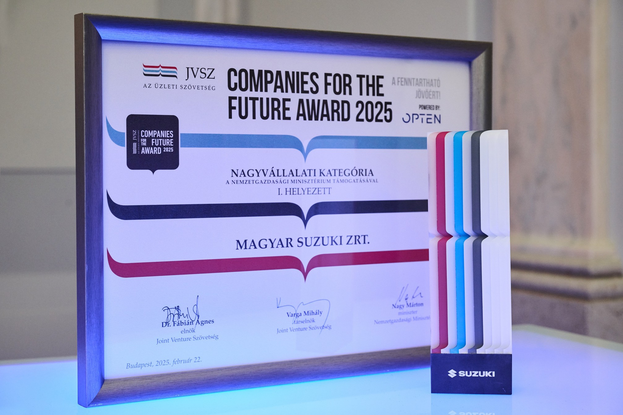 A Joint Venture Szövetség (JVSZ) 2025-ös Companies for the Future Award díjátadóján a Magyar Suzuki Zrt. érdemelte ki a nagyvállalati kategória fődíját.